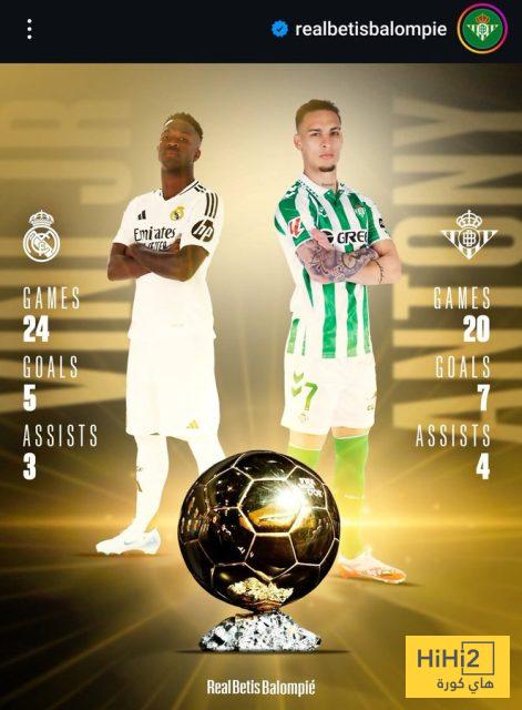 هاي كورة- نشر نادي ريال بيتيس عبر حسابه الرسمي على إنستغرام مقارنة رقمية بين نجمه البرازيلي أنتوني ولاعب ريال مدريد فينيسيوس جونيور، تسلط الضوء على أداء الثنائي في عام 2025، مع تعليق لافت يؤكد أن المنافسة على الكرة الذهبية هذا العام باتت تملك مرشحًا واضحًا.