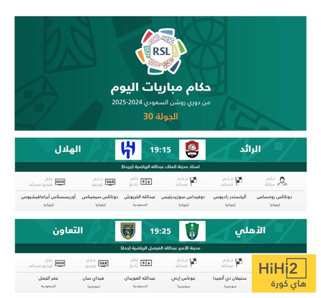 فيما يقود طاقم سويسري لقاء الأهلي والتعاون، بقيادة الحكم “ساوندرو سشارير”.